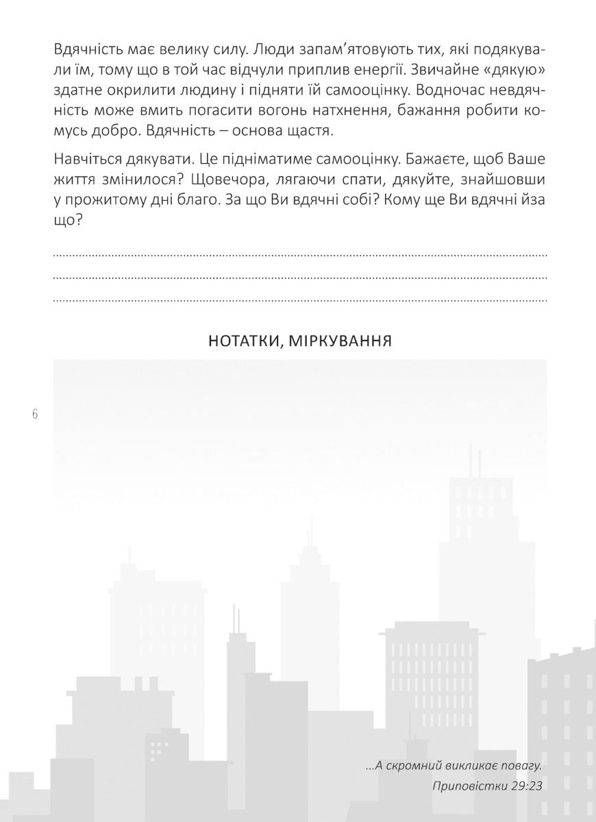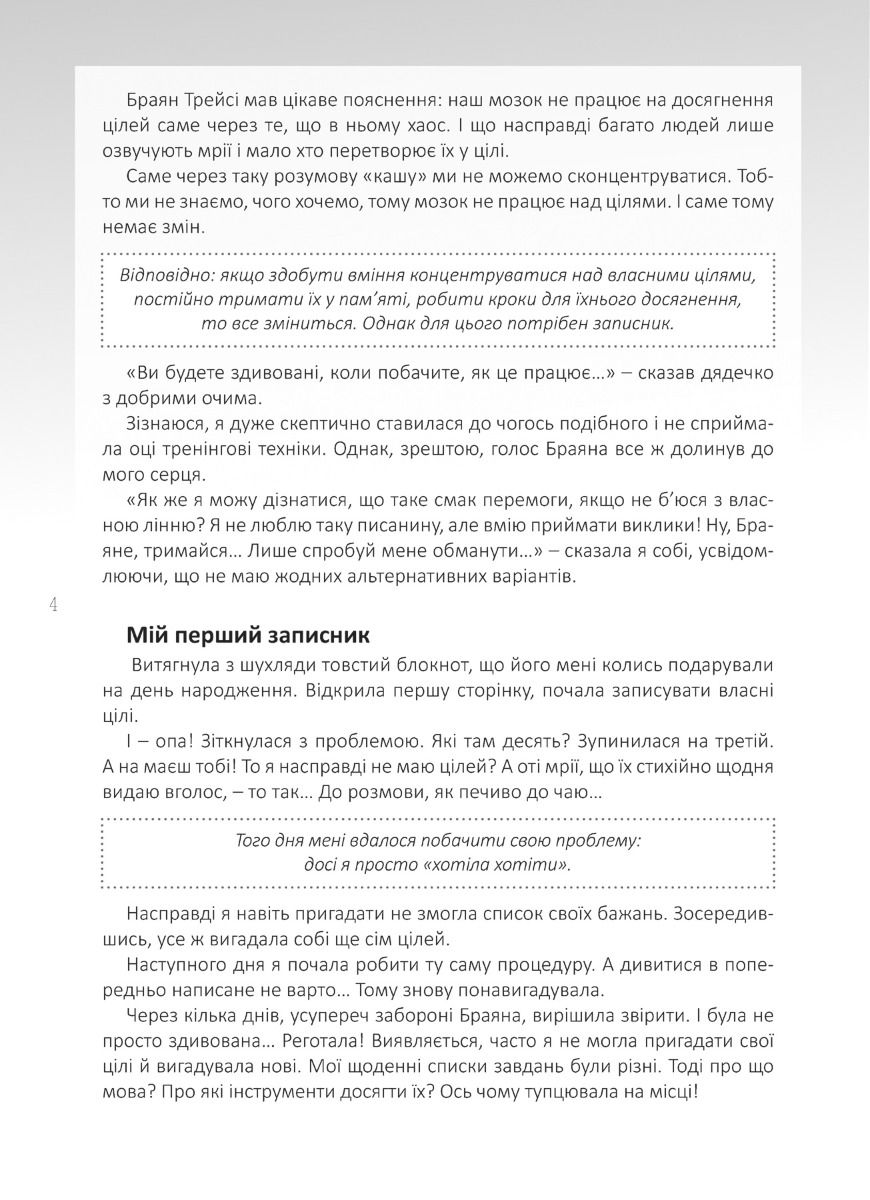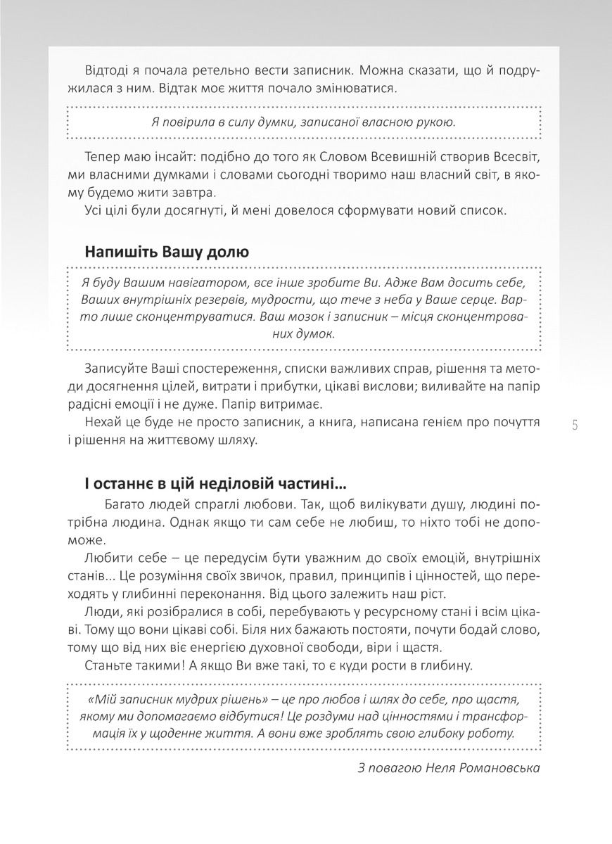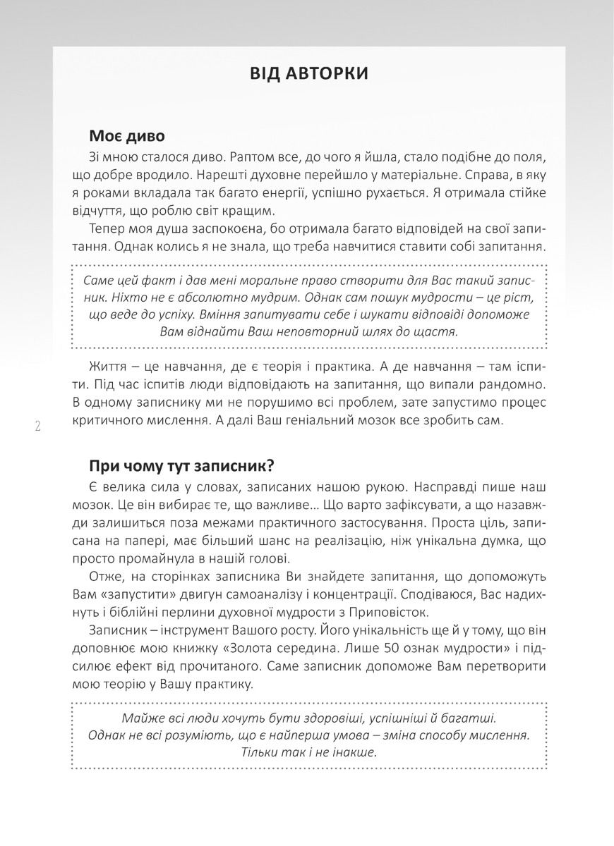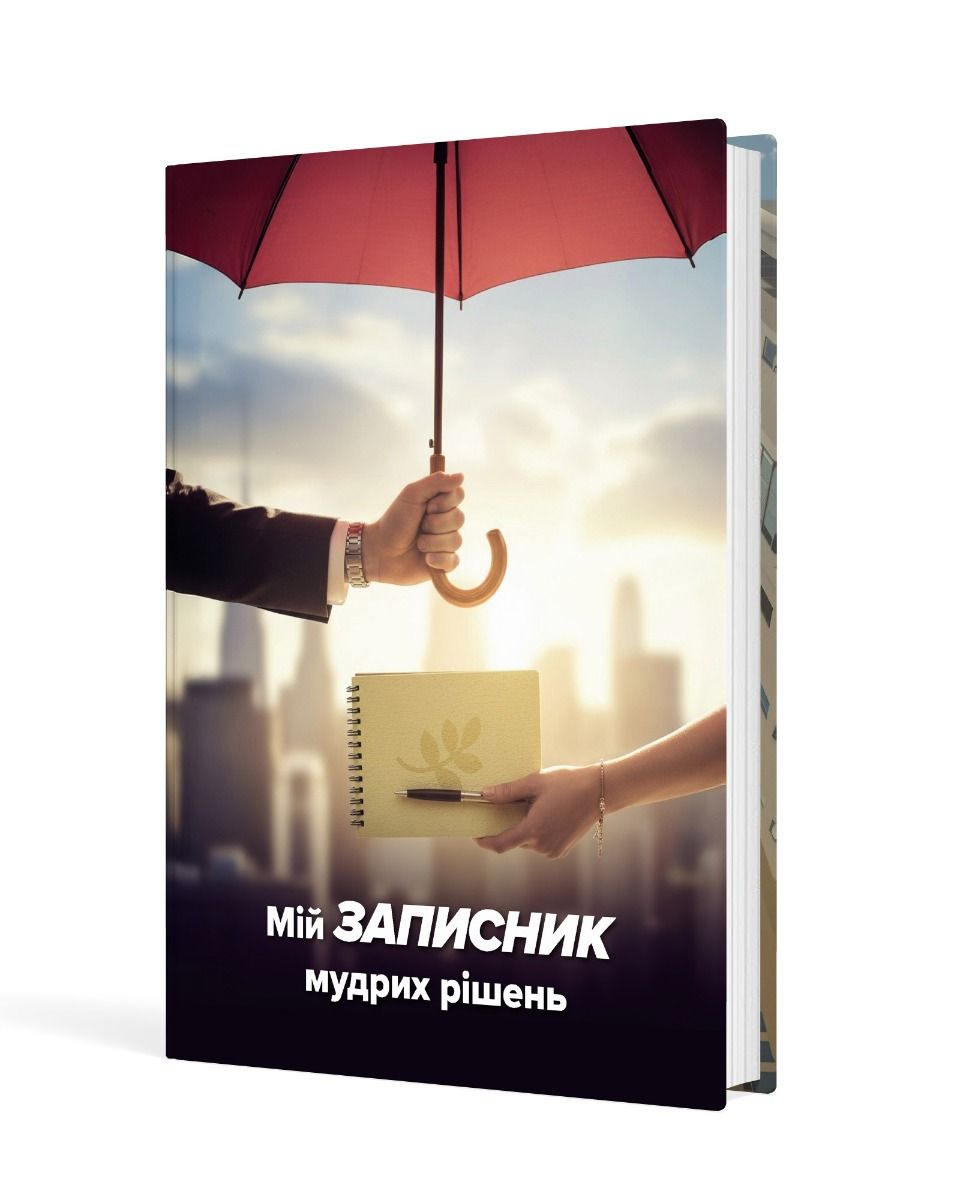 Записник мудрих рішень - це планер майбутніх змін, написаних власною рукою. Це посібник, який стимулює змінювати свідомість, спосіб мислення, рости духовно. А відтак – можливість споглядати, як духовне дає проекцію в матеріальний світ і веде до щастя.