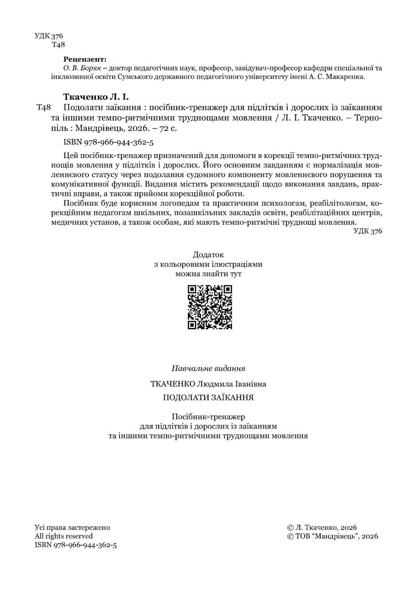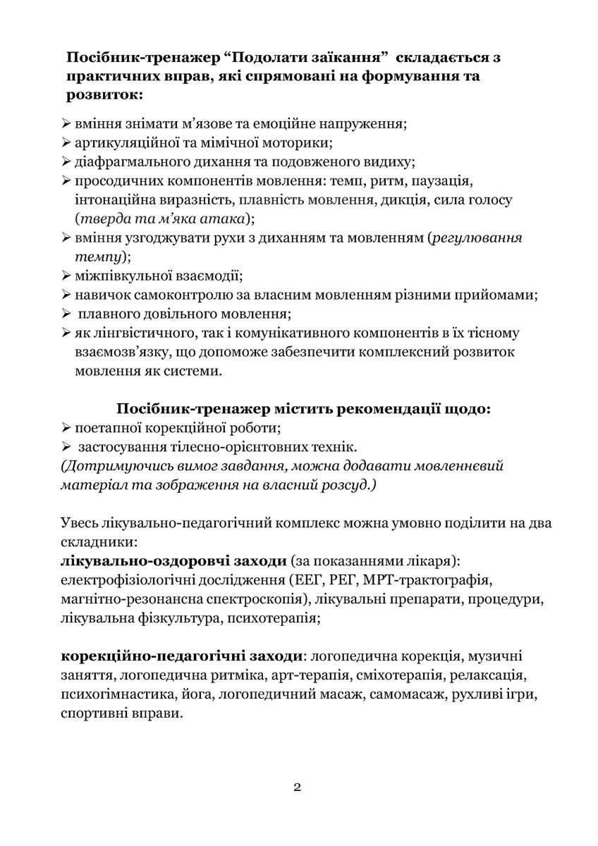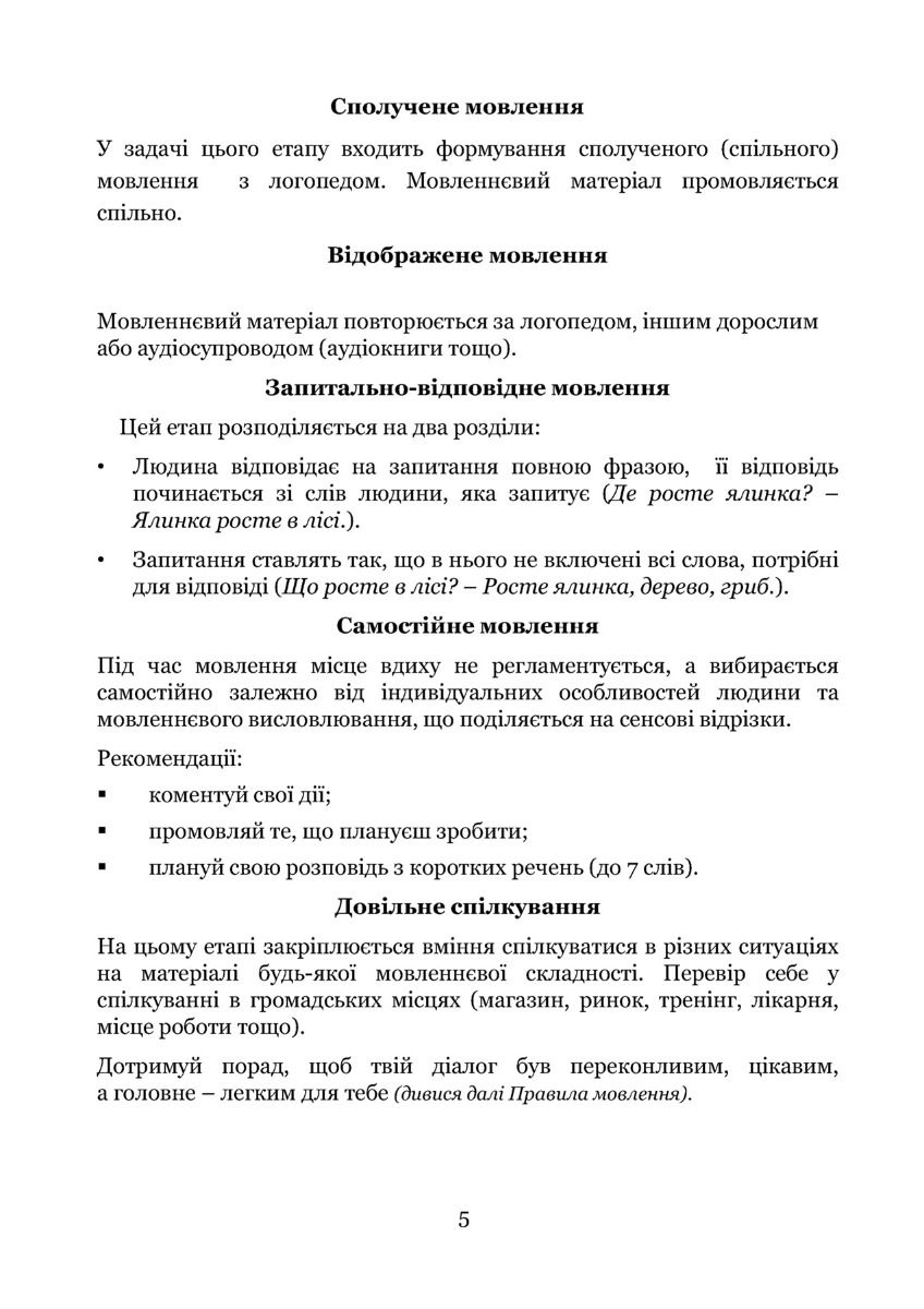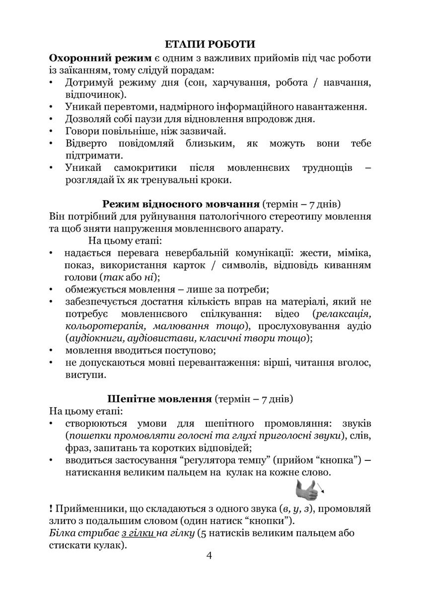 Цей посібник-тренажер призначений для допомоги в корекції темпо-ритмічних труднощів мовлення у підлітків і дорослих. Його основним завданням є нормалізація мовленнєвого статусу через подолання судомного компоненту мовленнєвого порушення та комунікативної функції. Видання містить рекомендації щодо виконання завдань, практичні вправи, а також прийоми корекційної роботи.